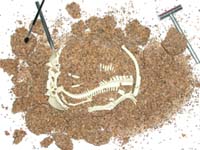 2、帶上防護眼鏡,從頂端開始依你的方式挖掘,直到碰觸到骨骼殘骸。手握鑿子,用尖的一端朝著"恐龍化石",然後用鎚子輕敲噸的那一端,輕敲時避免移動整塊"恐龍化石"。